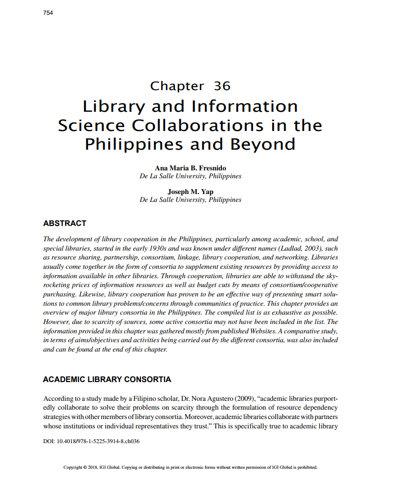 Fresnido, A. M., & Yap, J. M. (2018). Library and Information Science Collaborations in the Philippines and Beyond. In I. Management Association (Ed.), Library Science and Administration: Concepts, Methodologies, Tools, and Applications (pp. 754-779). Hershey, PA: IGI Global. doi:10.4018/978-1-5225-3914-8.ch036